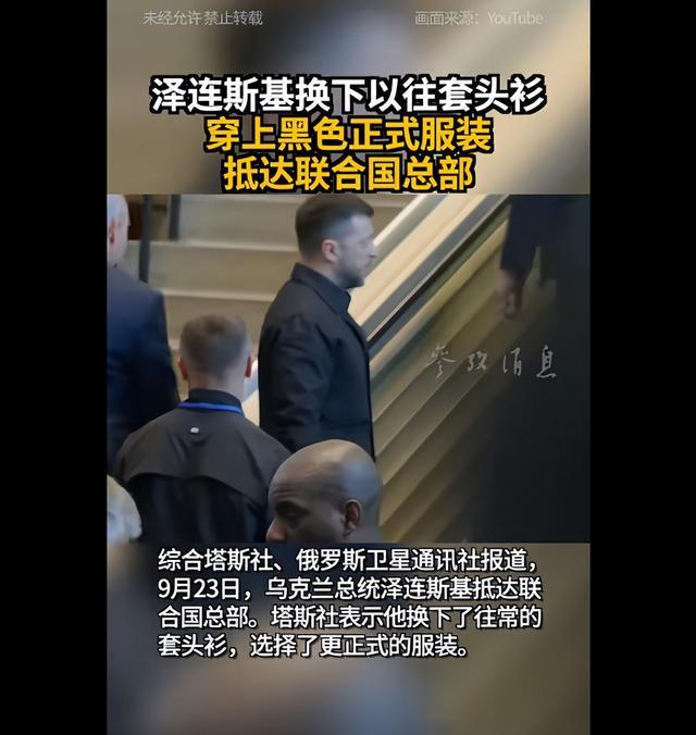 据参考消息,9月23日,乌克兰总统泽连斯基抵达联合国总部,他换下了往常的套头衫,选择了更正式的黑色服装。