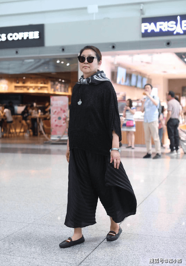 此外,丝巾并非一定要和裙装搭配使用,在日常穿搭中也同样可以展现优雅气质。比如倪萍选择的黑色短袖搭配黑色半裙,并以黑白丝巾作点缀,整体显得更有格调与时髦感。