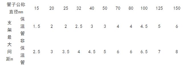 ⑴ 室内管道支架的设置原则一般为:散热器支管长度大于1.5m时,应在中间安装管卡活钩钉;采暖立管管卡设置,楼层层高≤5m时,每层设一个,楼层层高>5m时,每层不得少于两个。水平钢管支架最大间距如下: